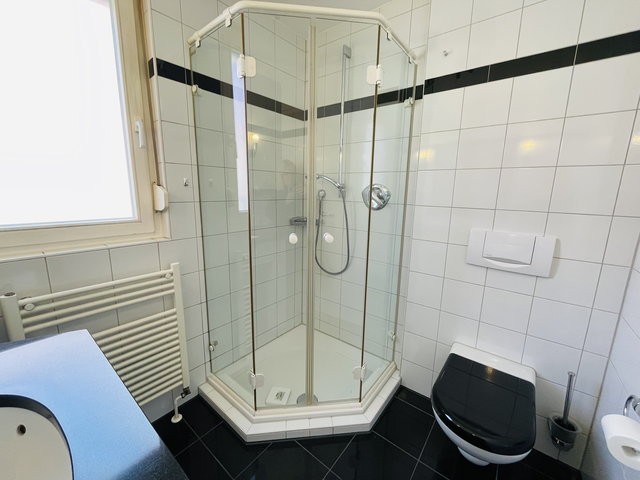 Das Badezimmer ist mit Dusche, WC und Fenster ausgestattet – hell, modern und komfortabel. Ein gemütliches Schlafzimmer mit einem praktischen Einbauschrank runden das Raumangebot ab.