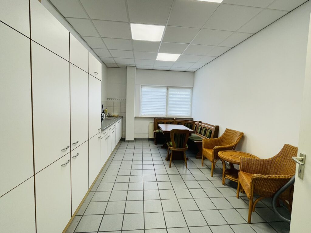 Eine Einbauküche steht zur gemeinschaftlichen Nutzung zur Verfügung und bietet zusätzlichen Komfort für den Arbeitsalltag. Ebenfalls gemeinschaftlich genutzt werden getrennte Damen- und Herren-WCs.