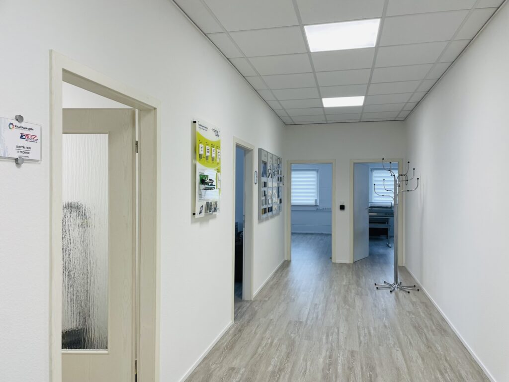 Bereits beim Betreten überzeugt der großzügige und helle Flurbereich, von dem aus die einzelnen Büroräume zugänglich sind.